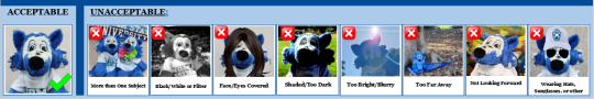 - Wearing hats, sunglasses or other items that obscure the face will not be accepted